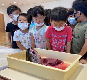 前日には、栄養士による鮭の解体を子ども達の前で行い、間近で見る大きな鮭やさばく様子に興味津々の子ども達でしたよ。
