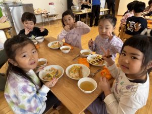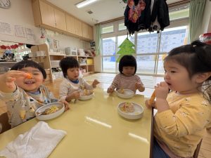 給食は、ひなまつり特別メニュー!ちらし寿司やエビフライ、おやつにはひなあられやひなケーキが出て、おいしそうに食べていましたよ!給食もおやつも「おいしいおいしい」とペロッと完食していたこどもたちでした♪