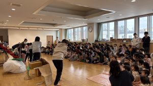 その後、保育士や子ども達も参加する劇「おおきなかぶ」を行いました。りす組、きりん組、ぞう組、らいおん組の各クラス数名が担任の先生と一緒に孫や猫、犬、ねずみになりきっておおきなかぶを引っ張ってくれましたよ!子どもたちは「うんとこしょ!どっこいしょ!」や「がんばれ~」と応援していました♪