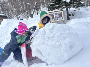子ども達は、自分達で米ぞりのコースを作ったり、大きな雪玉を友達と力を