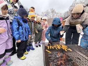 さらに焚火を囲んで干し芋を焼きました。じっくり温められた干し芋は、いつもと違うやわらかさと甘さで「おいしい!」と笑顔が溢れていました。