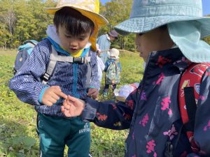 バッタを見つけると「こっちは茶色!」「あっちはピンク!」と同じ種類でも色や形をの違いに気づき、友達同士で見せ合う姿がありました。