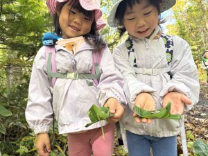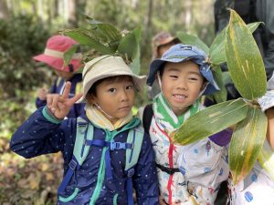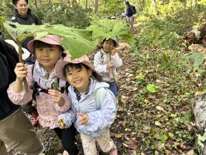帰りはフキの葉や笹を使って傘や冠をカツオ隊長が作ってくれると見つけた葉っぱを飾り付けてアレンジする子もいましたよ~!