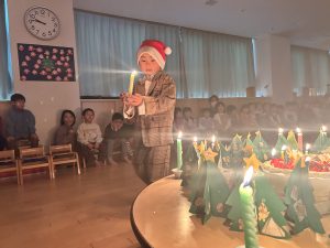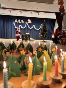 朝から子どもたちや、先生もおしゃれをしていつもと違う特別な朝です。らいおんさんのキャンドルサービスでクリスマス会はスタートです。