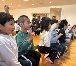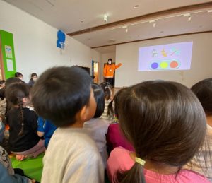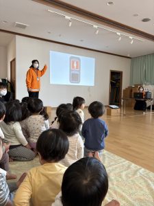 ひよこ組(0歳児)~らいおん組(5歳児)の全クラスのお友達がホールに集まり、白石交通安全推進課の方に映像を見ながら、冬道の歩き方について教えてもらいました。