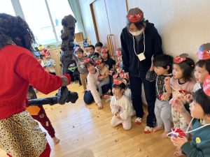 怖くて涙が出ちゃう子もいたけれど、お友達が一緒に戦おう!周りからの頑張れ~!の声援に勇気を振り絞ったらいおんさん、見事赤鬼も倒してくれました!!
