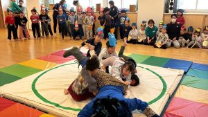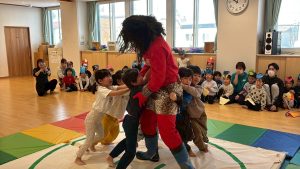 それでも強い鬼たちには、年長ぐみのらいおんさんが相撲の勝負で戦いました。青鬼を倒して、大将の赤鬼登場!