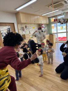 乳児さんは鬼に変身した先生と対決!豆まきがんばりました!